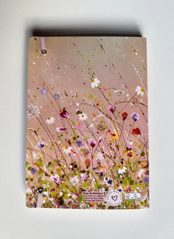 This enchanting notebook design is our very popular ‘Over The Rainbow’ design, which captures the whimsical essence of wildflower fields: a perfect blend of colourful blooms, a serene rainbow, playful ladybirds, a fluttering butterfly and busy bumblebees.